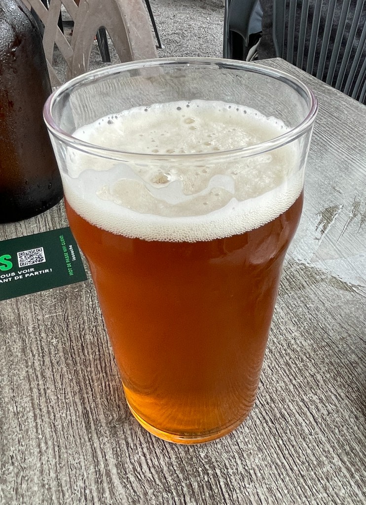Mon passage coïncidait avec cet instant de l’année où le récent bourgeonnement des feuillus laisse sortir leurs plus belles teintes verdâtres. Enveloppée dans ces verts tendres, j’ai gravi les côtes, parfois accompagnée de quelques mouches qui avaient senti l’appel de l’été, parfois sous de fines gouttelettes. Arrivée à mon premier arrêt brassicole, malgré cette journée monochrome et légèrement pluvieuse, la terrasse de la Souche Stoneham fut des plus accueillantes avec sa toile géante qui m’a gardée au sec le temps d’un petit ravitaillement. Étant une habituée de la succursale de Limoilou, j’ai apprécié le caractère plus campagnard de celle de Stoneham, adjacente au terrain de golf, dont la terrasse partage l’espace avec une modeste houblonnière.