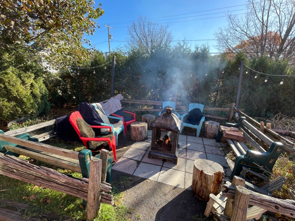 Au quarante-et-unième kilomètre, nous y voilà enfin, et quel accueil : dehors, un feu de foyer et des couvertures sont au rendez-vous! Même si l’extérieur est plutôt accueillant, j’ai besoin d’un grade supérieur de chaleur et j’entre dans cette ancienne grange reconvertie en restaurant. J’y découvre un lieu rassembleur, rempli à craquer. Ça sent le bonheur à plein nez!