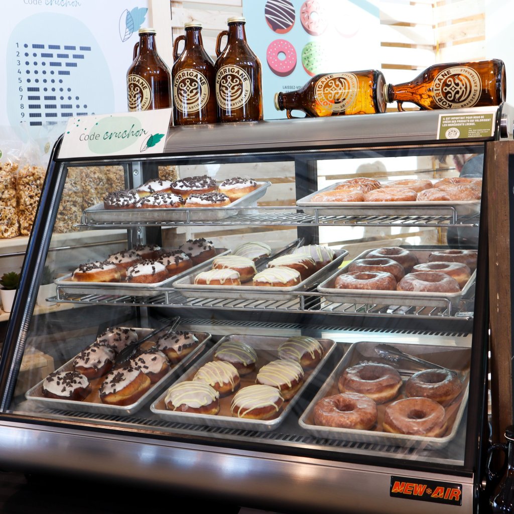 Il y a aussi une production considérable de cruchons pour emporter et on est aussi très sensible à la récupération des ingrédients résiduels après le brassage. La drêche est donc utilisée pour confectionner les pains hamburgers, on récupère aussi de la bière pour cuisiner des sauces et pour fabriquer les succulents beignes qu’on voit dans le présentoir à l’entrée. Si vous n’avez pas encore goûté à ces divins desserts, courez vite remédier à la situation!