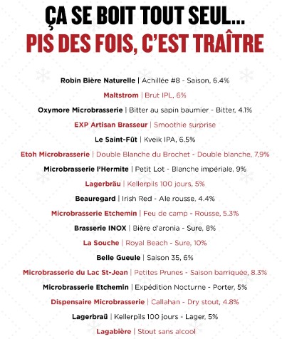 En douze ans, intervalle de temps entre ma toute première expérience d’un festival de bières d’hiver et la plus fraîche, je suis bien heureuse de voir que les événements brassicoles et tous les festivals qui en découlent ont encore la cote. D’autant plus que je ne peux que me réjouir de constater que la clientèle que j’y croise est de plus en plus hétérogène; tous les genres, les âges et les goûts en font partie. Enfin, bravo à l’organisation Je bois local! On se souhaite une belle édition 2025 et plusieurs autres déclinaisons du même genre… un 100% IPA 2024 peut-être?