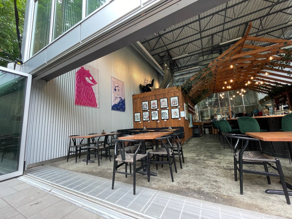 Je rejoins rapidement, mais presque déçue que ça s’achève, la microbrasserie Knowlton et Co. À mi-chemin entre un chalet de luxe et une galerie d’art, la microbrasserie offre plusieurs déclinaisons de bières, magnifiquement représentées par des sérigraphies de type BD. Je ne profite malheureusement pas de l’offre alimentaire alléchante et me gâte d’une canette de IPA pour emporter; ce ne sera que partie remise!